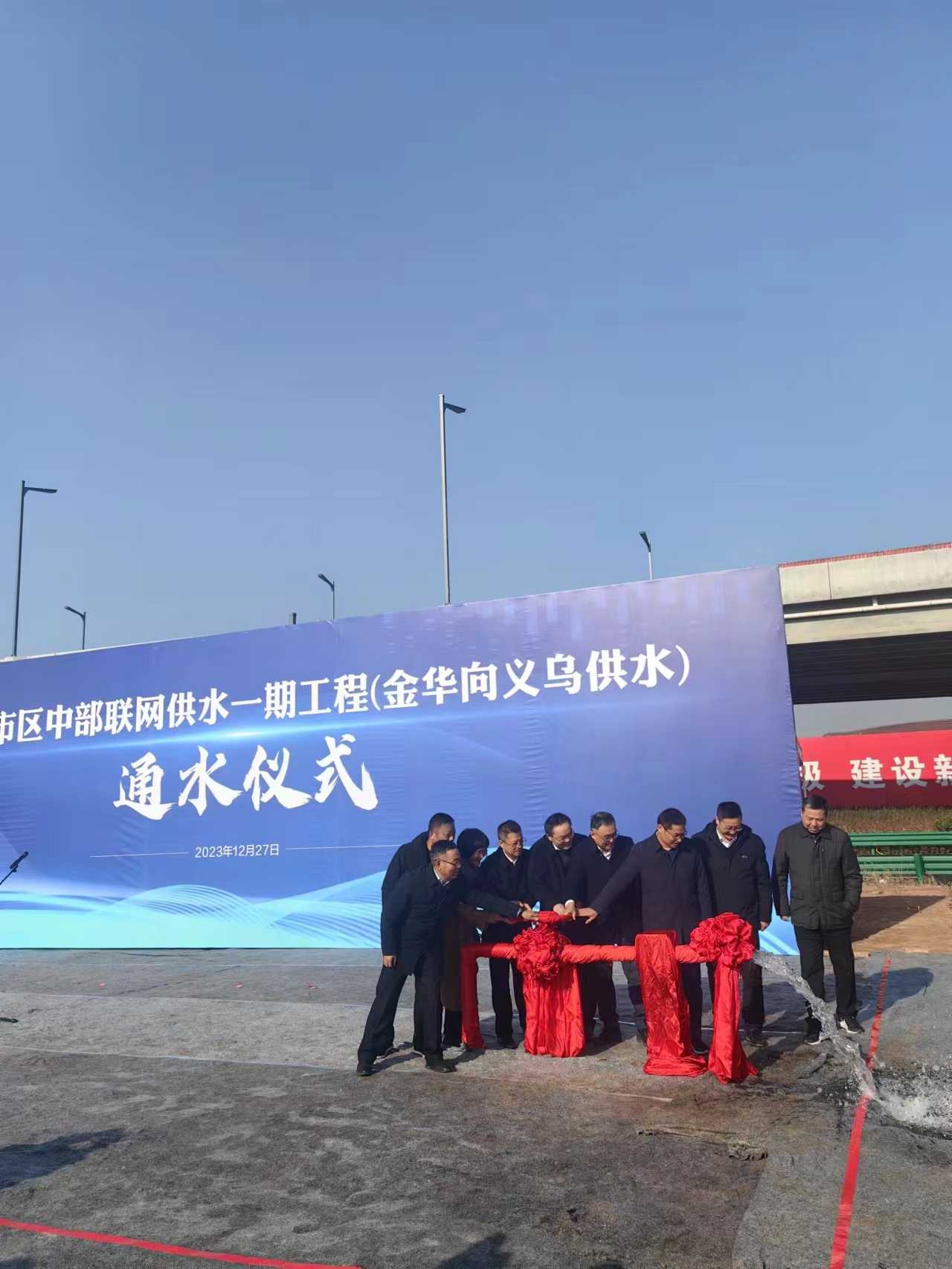 12月27日上午,在金义都市区中部联网一期工程中央大道与华东街交叉处,随着一股清泉从供水管道口喷涌而出,由第六分公司承建的金华—义乌供水工程实现正式通水。金华市政府、金华市城投集团等相关单位共同见证了该通水仪式。