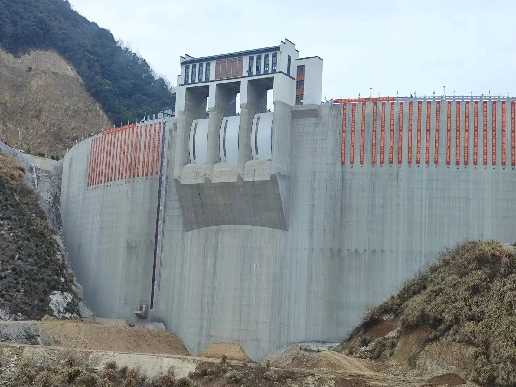 在临安区委、区政府的正确领导下,在临安区水利水电局和工程建设指挥部的精心组织和指导下,山东水总作为社会资本方与政府股东方临安水利开发公司迅速完成了项目公司组建及参建单位招标工作,高标准、高质量推进项目建设,将安全文明标准化、党建引领和科技创新融入到项目建设的全过程,先后荣获了“浙江省水利文明标准化工地”和“党建进工地”示范工程,获得了1项水利行业工法、6项发明专利和9项QC成果,2项科技成果被工信厅立项。特别是施工期间克服了新冠疫情、超长汛期、料场重大设计变更及高坝、拱坝施工技术难度大等不利因素影响,历经1650天的日夜奋战,终于迎来了双溪口水库下闸蓄水这一重要时刻。